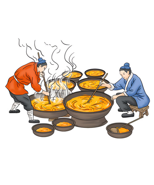 • 漂洗后的芝麻,以鐵鍋碳火慢炒至香味溢出。其中炒芝麻的手法、火候及加料工藝等,都以獨特的秘訣形式由師徒間代代傳承。